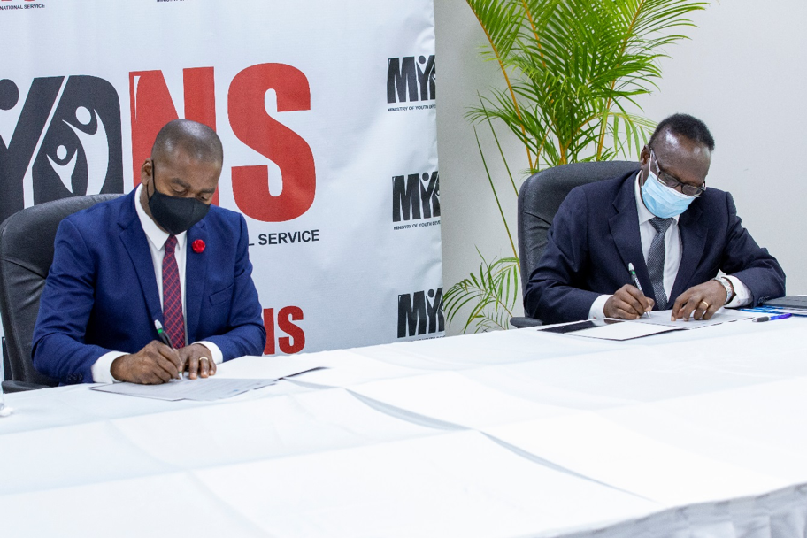 The Honourable Foster Cummings, Minister of Youth Development and National Service Dr. Aloys Kamuragiye, UNICEF Representative for the Eastern Caribbean signs the Letter of Intent between the MYDNS and Generation Unlimited.