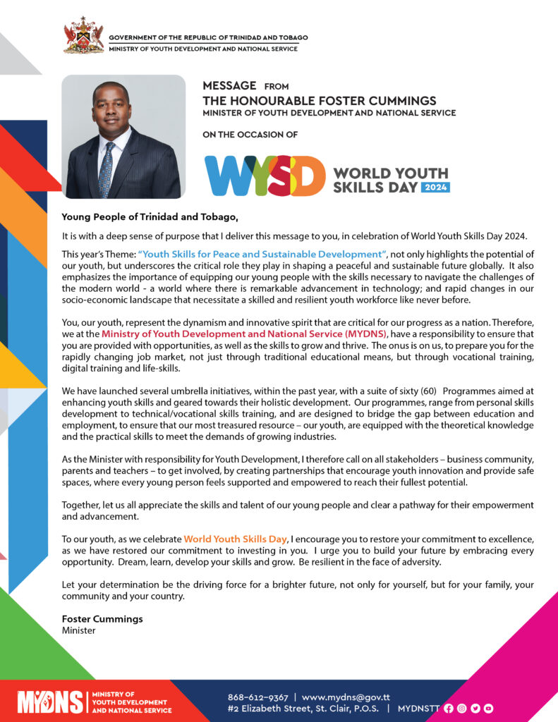 Categories Uncategorized Message from the Honourable Foster Cummings on the occasion of World Youth Skills Day 2024 Post author By admin Post date July 15, 2024 ← MYDNS Launches Plumbing Programme – An Opportunity for Youth Productivity → National Service Programme for Trinidad and Tobago (NSP-TT) Launch